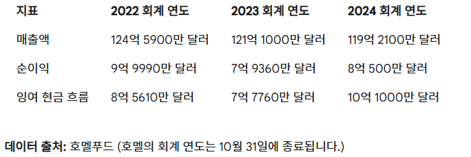 호멜푸드는 애플게이트, 버크, 오스틴 블루스, 내추럴 초이스 등 다양한 브랜드로 햄, 소시지, 닭고기, 소고기, 양고기 등 다양한 포장 및 냉장 식품을 제공하는 식품 가공 회사입니다. 인플레이션으로 인해 비용이 증가하면서 2022 회계 연도부터 2024 회계 연도까지 매출과 순이익이 감소했습니다.