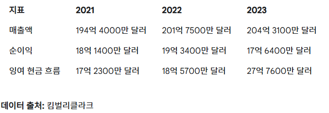 킴벌리클라크는 코튼엘, 하기스, 크리넥스, 코텍스 등 유명 브랜드로 여성 위생용품, 개인 위생용품, 유아용품을 제조 및 판매하는 소비재 대기업입니다. 2021년부터 2023년까지 꾸준히 매출이 증가했습니다.